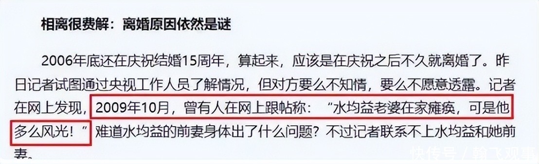 有消息称:王君曾在一场车祸中重伤瘫痪,而水均益竟在此之后提出离婚,转头迎娶新欢,并育有两个孩子。